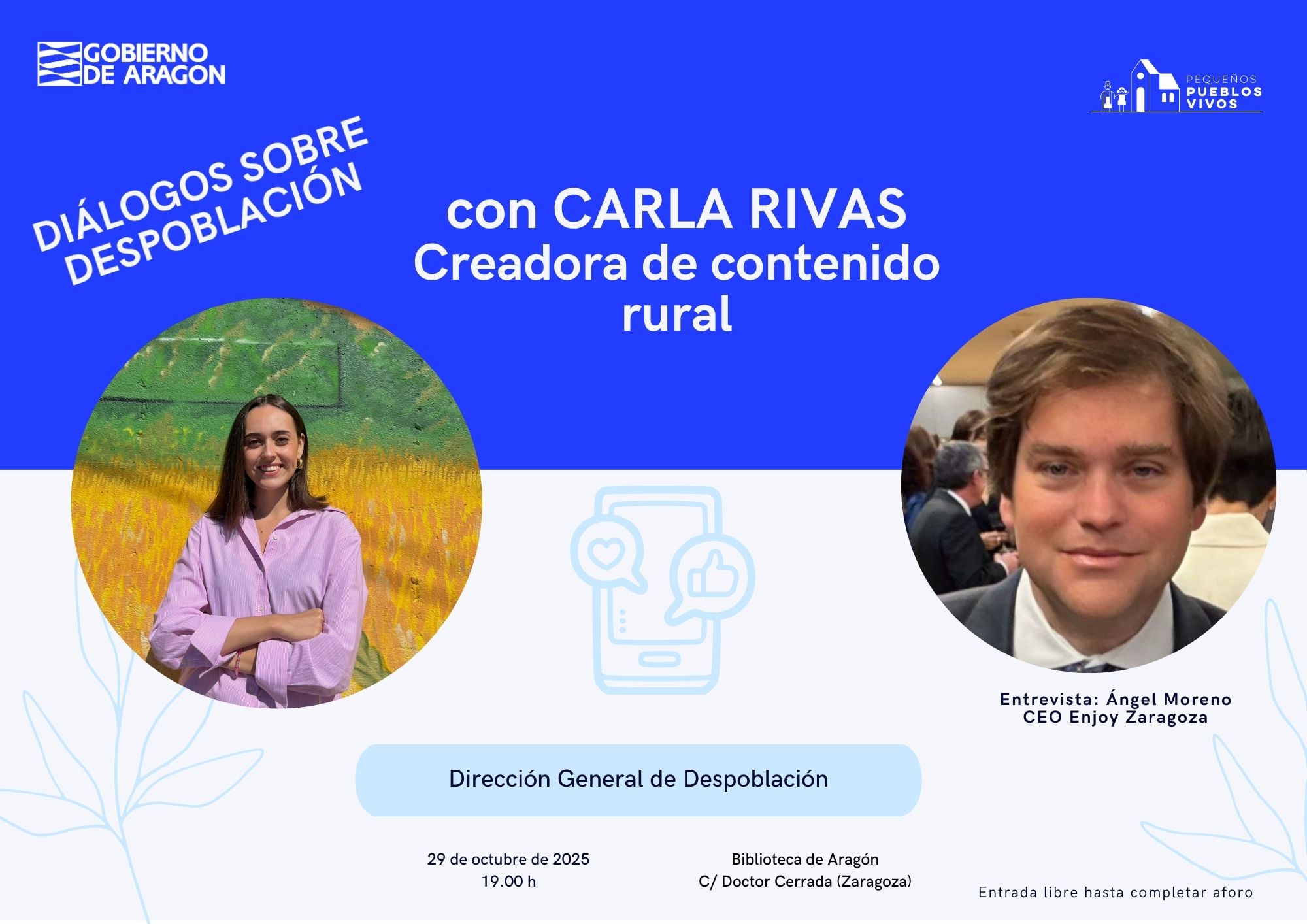 PRÓXIMAMENTE: Carla Rivas: Ganadora Premio a la Creación de Contenido de Promoción Rural . El 29 de octubre de 2025 a las 19.00h en el Salón de Actos de la Biblioteca de Aragón. Zaragoza.