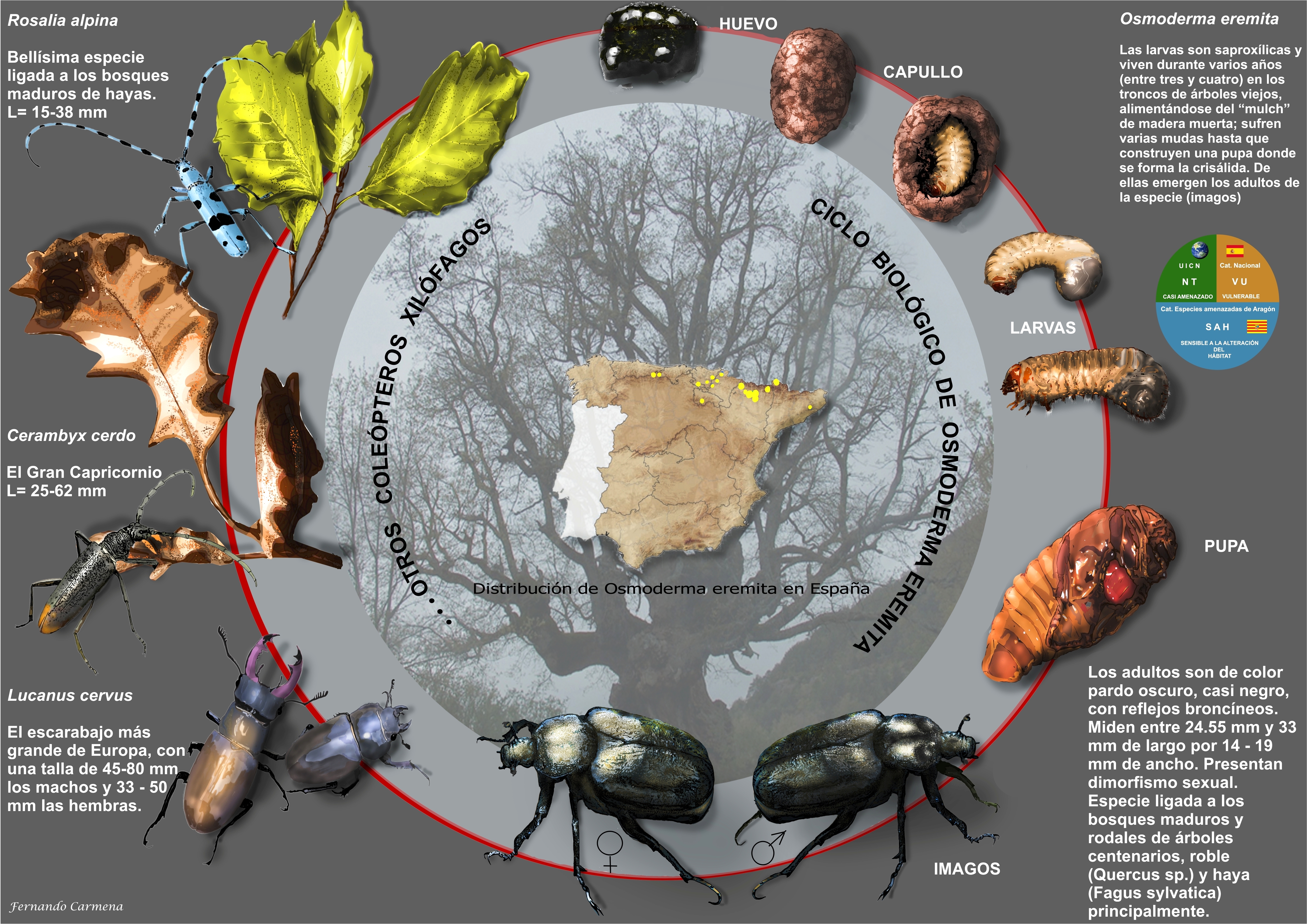 - Osmoderma eremita (JPG, 6 MB). Aparece representado el ciclo biológico del coleóptero saproxílico Osmoderma eremita y su distribución en España. También figuran otros coleópteros xilófagos y una somera descripción de las especies representadas.