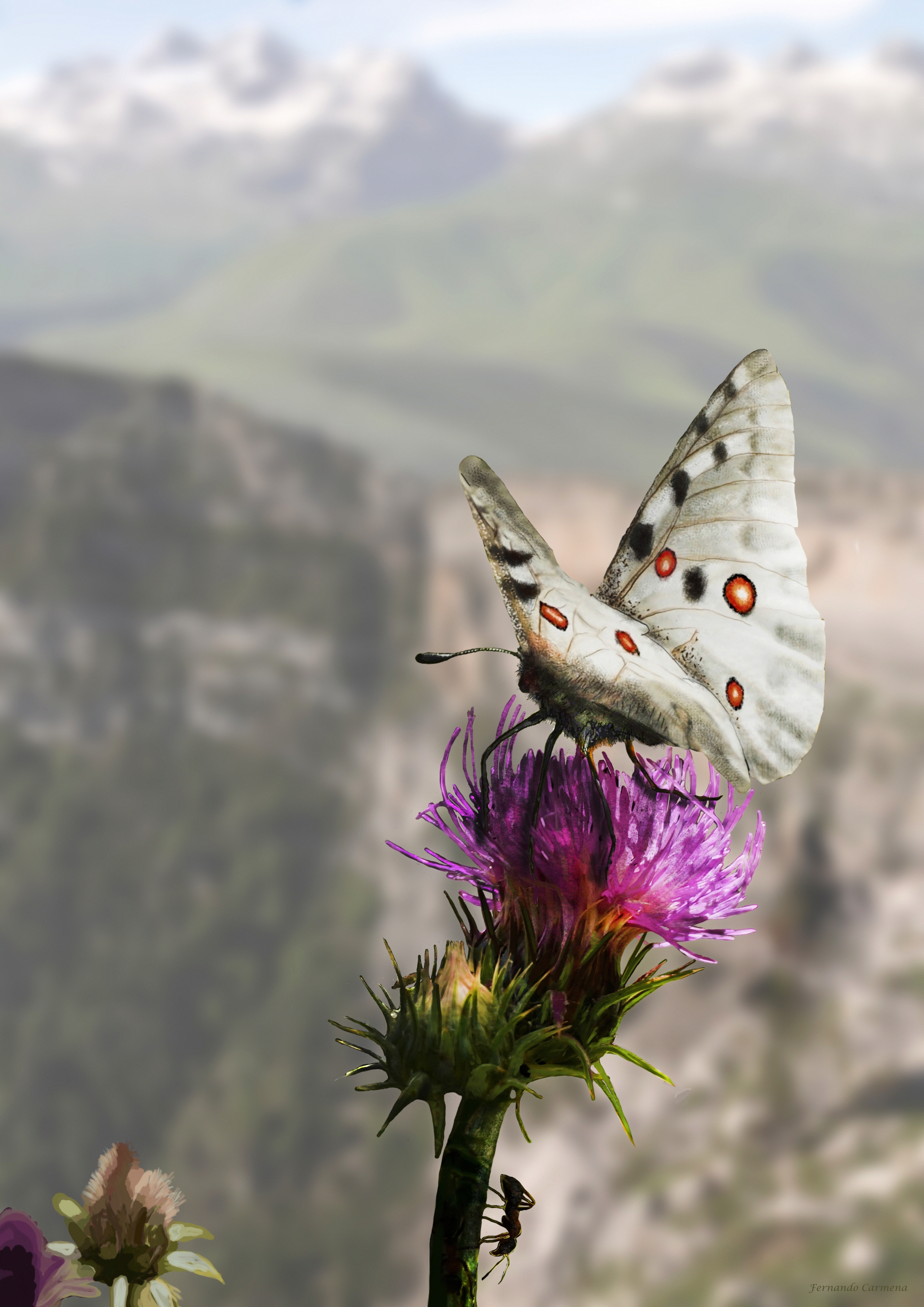 - Parnassius apollo (JPG, 9 MB). La mariposa apolo (Parnassius apollo) sobre un cardo y con el telón de fondo del Cañón de Añisclo desde la cima de Sestrales.