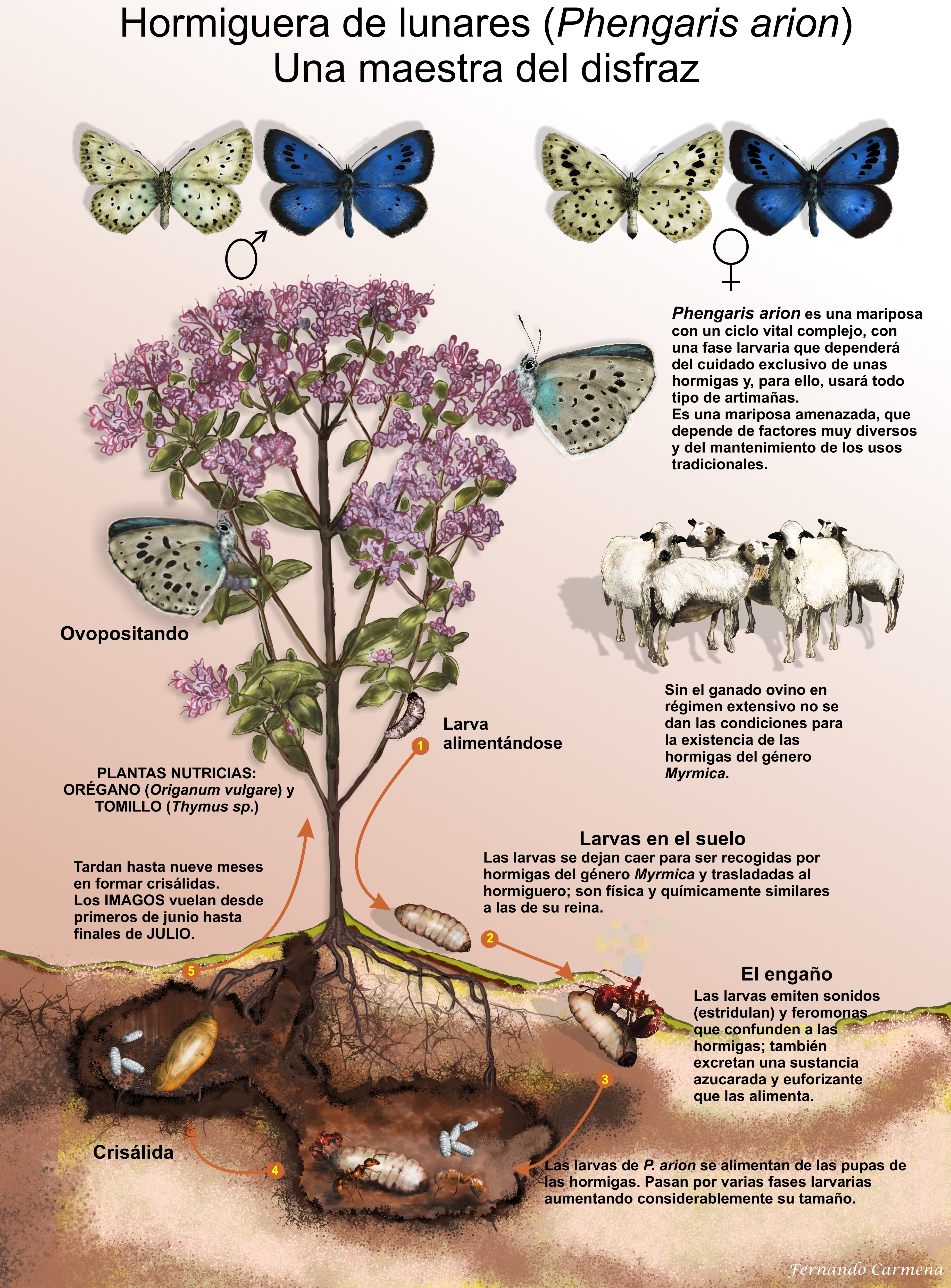 - Phengaris arion (JPG, 8 MB). La muy escasa hormiguera de lunares (Phengaris arion) es una maestra del engaño. En la lámina se ilustra el singular ciclo biológico de esta especie y su relación con algunas hormigas del género Myrmica, así como su dependencia del mantenimiento de los usos tradicionales.