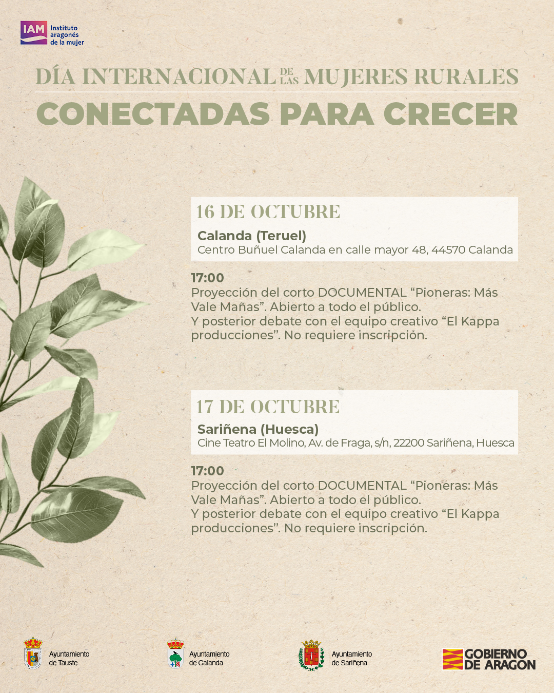 Posteriormente, los días 16 y 17 de octubre se proyectará el corto "Pioneras, Más Vale Mañas” con un posterior debate con el equipo creativo en las localidades de Calanda y Sariñena, respectivamente. Corto en el que cuatro mujeres aragonesas emprendedoras relatan cómo han apostado por instalarse en el medio rural con proyectos originales e innovadores, mostrando como el emprendimiento, la innovación y el empoderamiento femenino transforman las zonas rurales y contribuyen al desarrollo sostenible.