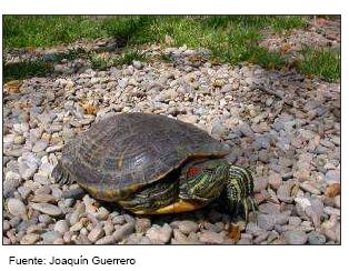 El galápago de Florida (Trachemys scripta subsp. elegans), en la imagen, compite con mucha eficacia y desplaza a los dos galápagos autóctonos, el europeo (Emys orbicularis) y el leproso (Mauremys leprosa), por ser más voraz y agresivo.
